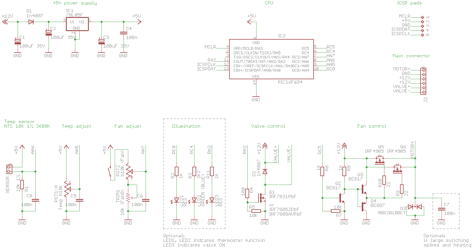 Режими роботи та підсвітка організована світлодіодами, підключеними безпосередньо до виходів МК. Це не обов’язкова опція і світлодіоди LED1...LED3 разом з резисторами R2, R3, R11 можна і не впаювати, але я рекомендую використати червоний світлодіод LED1 та зелений LED2 для індикації режимів термостату та підсвітки. Світлодіод LED3 можна встановити, щоб було видно стан електроклапану. Яскравість кожного світлодіода можна встановити комфортну, підібравши опір відповідного резистора, але не менше 220Ом.